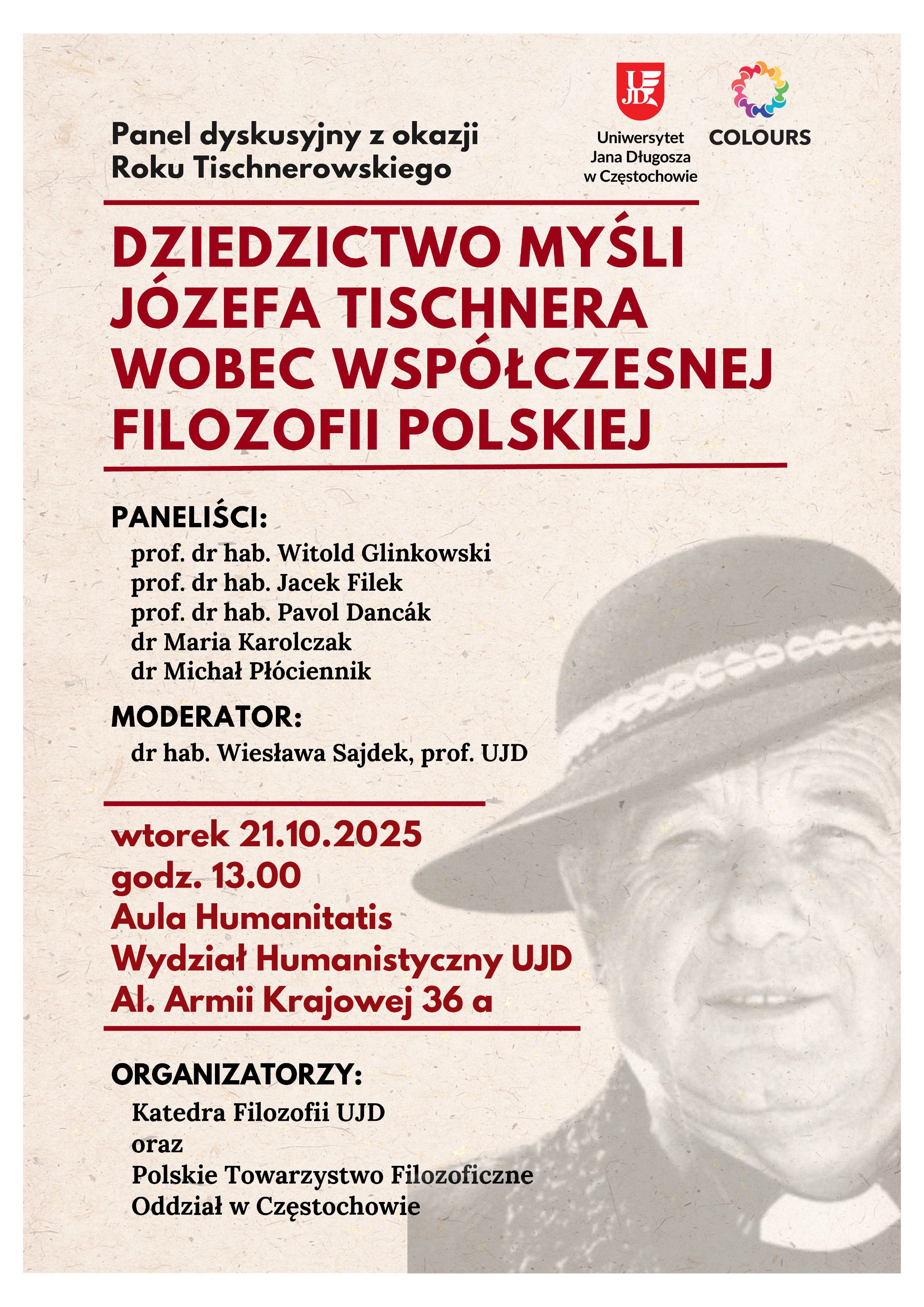Katedra Filozofii Uniwersytetu Jana Długosza w Częstochowie oraz Polskie Towarzystwo Filozoficzne Oddział w Częstochowie serdecznie zapraszają na panel dyskusyjny pt. „Dziedzictwo myśli Józefa Tischnera wobec współczesnej filozofii polskiej” organizowany z okazji obchodzonego Roku Tischnerowskiego, który odbędzie się 21 października 2025 roku w Auli Humanitatis Wydziału Humanistycznego Al. Armii Krajowej 36a o godz. 13:00.