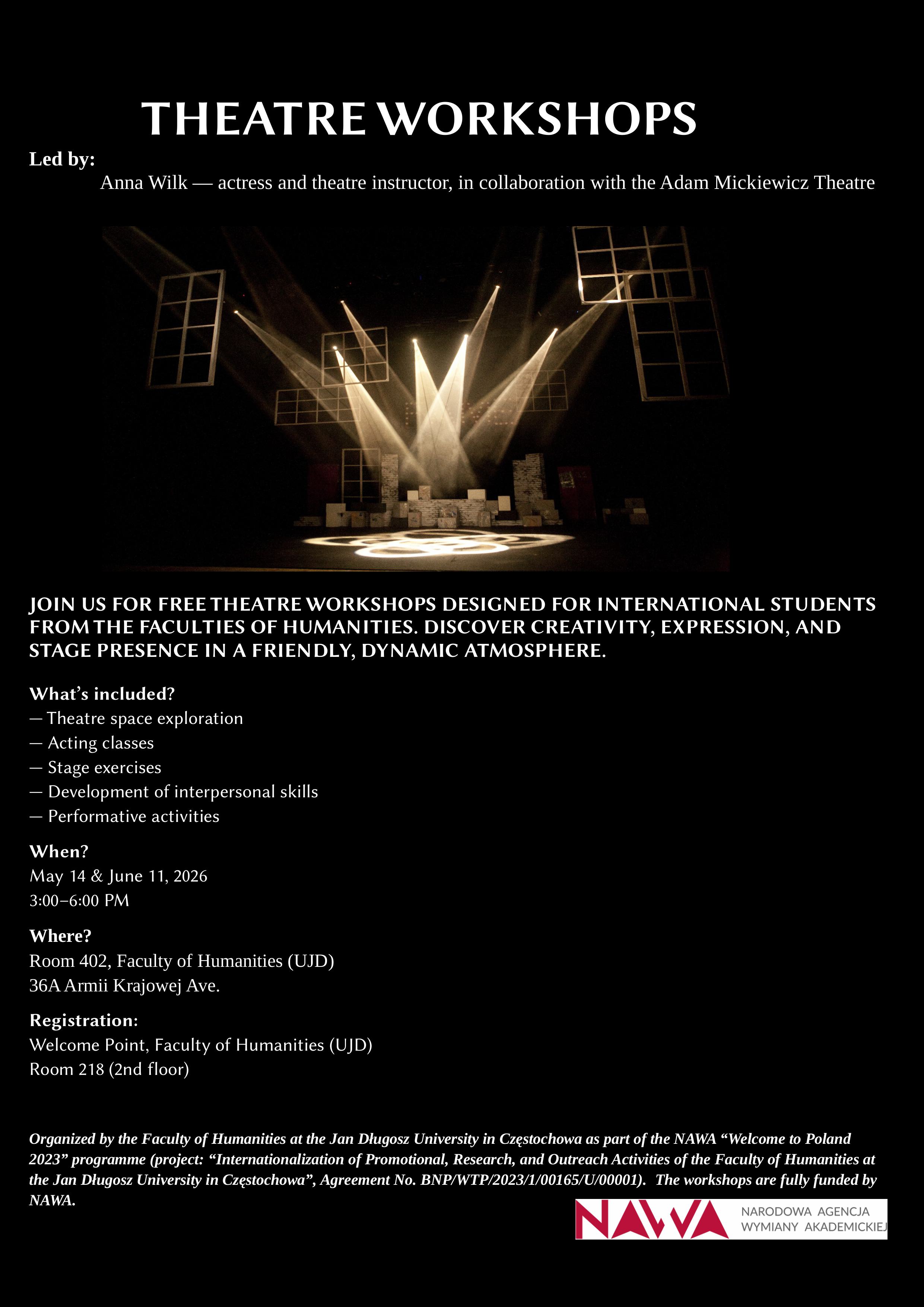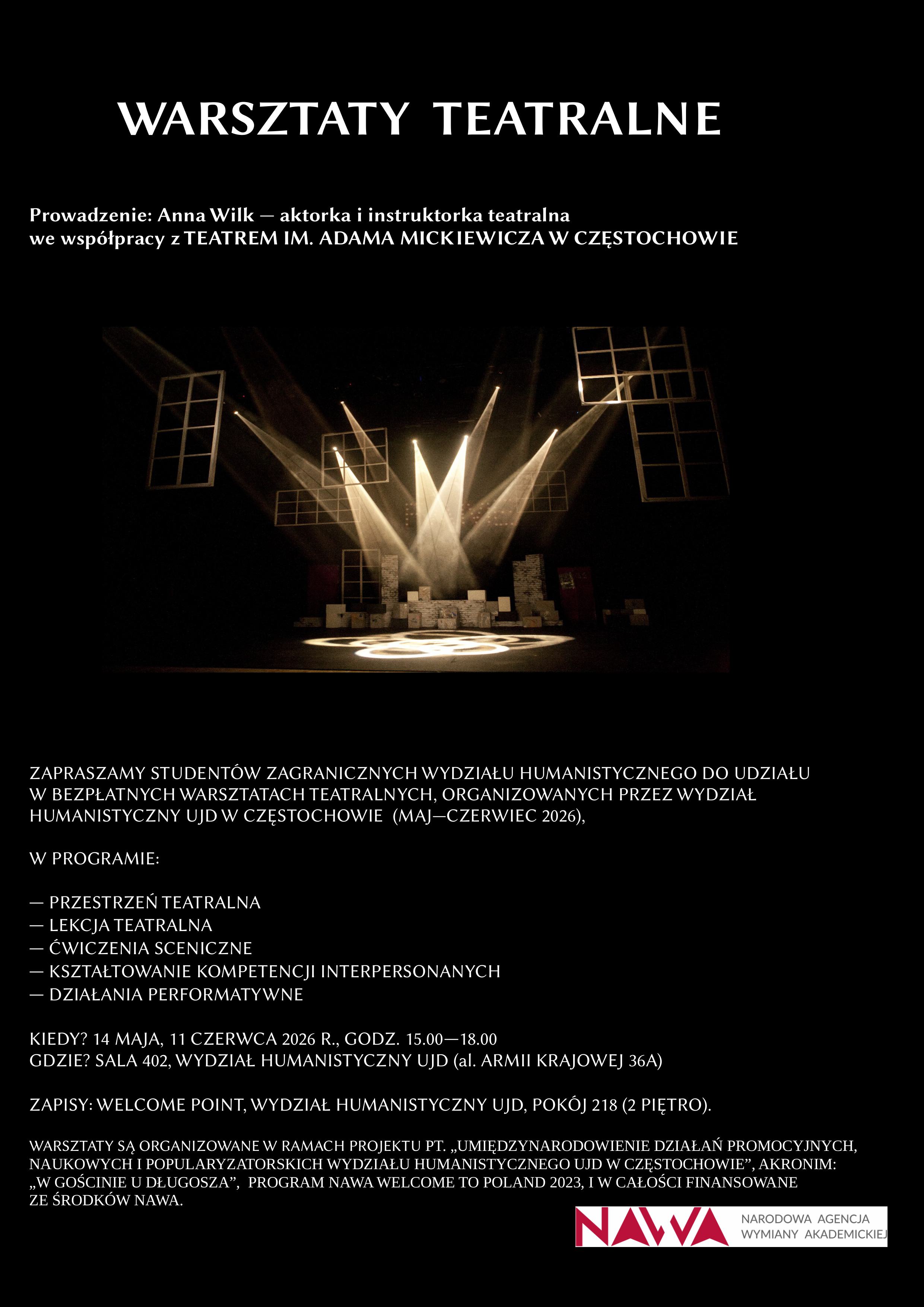 Serdecznie zapraszamy wszystkich studentów zagranicznych Wydziału Humanistycznego UJD w Częstochowie do udziału w bezpłatnych warsztatach teatralnych prowadzonych przez aktorkę oraz instruktorkę teatralną, Annę Wilk, we współpracy z Teatrem im. Adama Mickiewicza w Częstochowie, która pokaże studentom zagranicznym przestrzeń teatralną, poprowadzi ćwiczenia sceniczne, zaangażuje w działania performatywne.